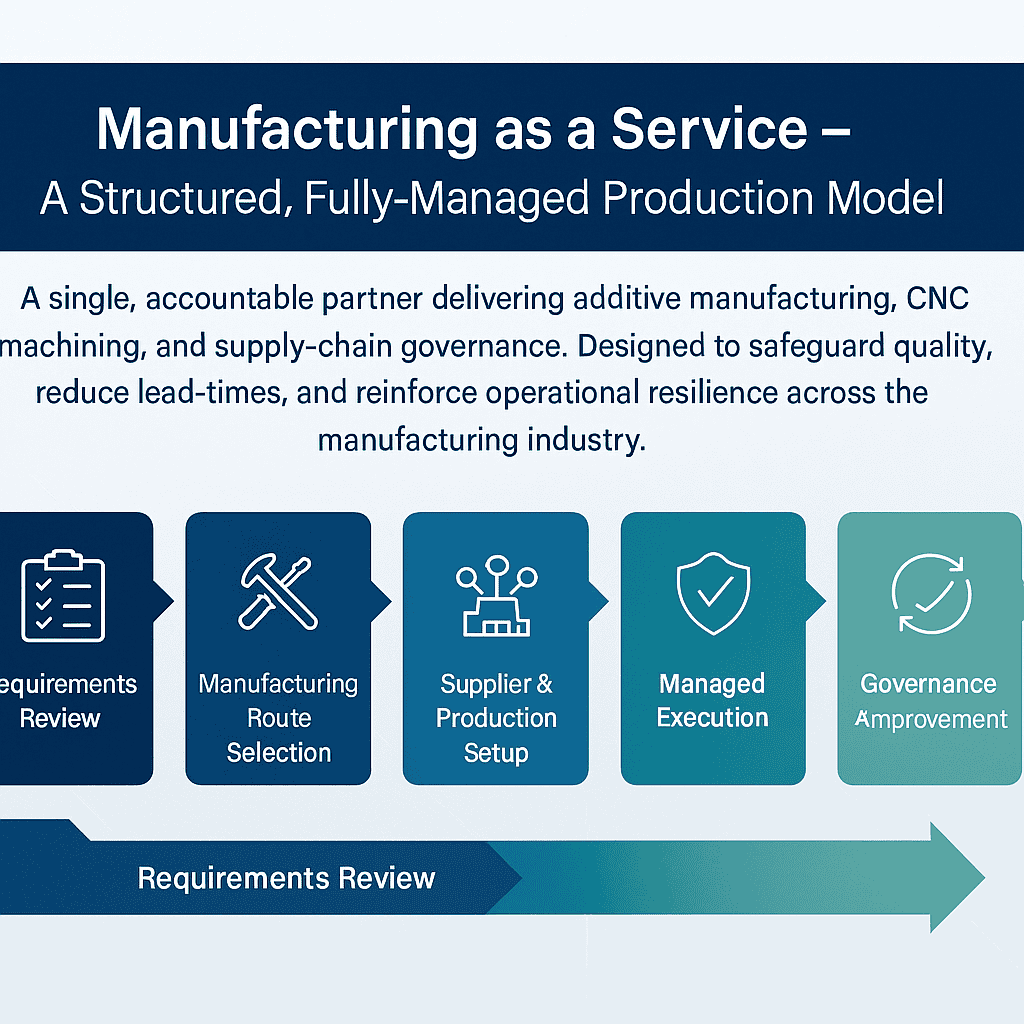 Modern supply chains face pressure: fluctuating demand, extended lead-times, rising costs, and the constant need for technical capability. MaaS addresses these challenges through a professionally governed, on-demand manufacturing framework.